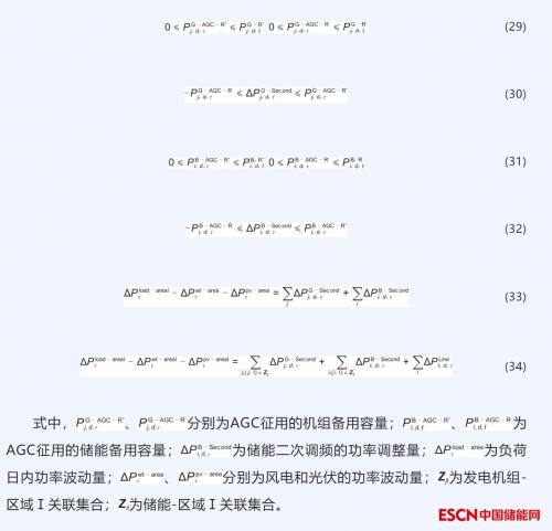 调频运行模拟约束条件包含发电机及储能系统的调频约束、电网功率平衡约束等。式(29)表示AGC可征用的机组备用容量约束,式(30)为机组二次调频约束。与常规机组类似,式(31)~(32)表示储能的调频约束。式(33)表示日内负荷、新能源发生计划外波动时的功率平衡约束,此外各控制区也要满足功率平衡,以区域Ⅰ为例见式(34)。