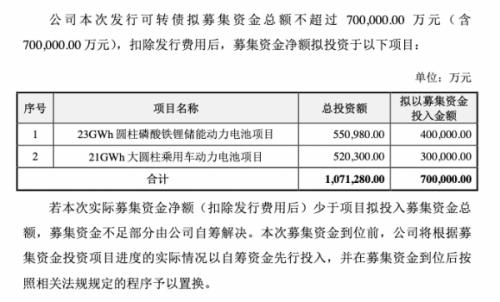 电车汇消息:12月9日晚间,亿纬锂能发布创业板向不特定对象发行可转换公司债券预案。本次拟发行可转债募集资金总额不超过人民币70亿元,募集资金净额拟投资于以下项目:23GWh圆柱磷酸铁锂储能动力电池项目、21GWh大圆柱乘用车动力电池项目。
