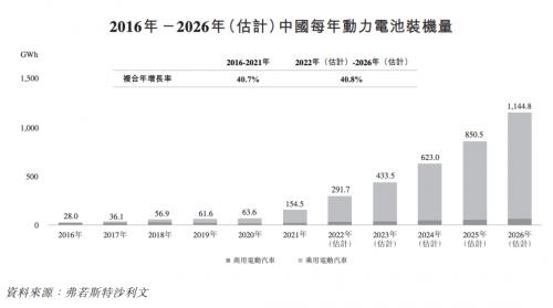 中国每年动力电池的装机量自2016年的28.0GWh增加至2021年的154.5GWh,复合年增长率为40.7%,并预期将进一步增长至2026年的1,144.8GWh,2022年至2026年间的复合年增长率为40.8%。