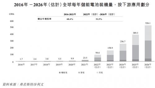此外,瑞浦兰钧的动力电池产品亦通过直接出口及主机厂出口等方式应用于海外市场,包括中东、非洲、东南亚及印度。全球动力电池市场同样面临了强劲的增长,每年动力电池的装机量自2016年的41.2GWh增加至2021年的293.7GWh,复合年增长率为48.1%,并预期将进一步增长至2026年的1,845.2GWh,2022年至2026年间的复合年增长率为39.1%。