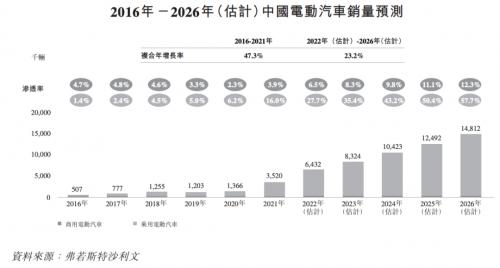 据弗若斯特沙利文数据显示,2021年中国是全世界电动汽车销量最高的国家,共为352万辆电动汽车,预期将于2026年达到1481.2万辆,2022年至2026年将按复合年增长率23.2%增长,乘用电动汽车及商用电动汽车的渗透率分别为57.7%及12.3%。