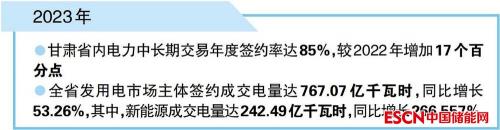 中国储能网讯:12月21日,2023年甘肃省内电力中长期年度补充交易结果发布,甘肃全省发用电市场主体签约成交电量达767.07亿千瓦时,同比增长53.26%。2023年甘肃省内电力中长期交易年度签约率达85%,较2022年增加17个百分点。
