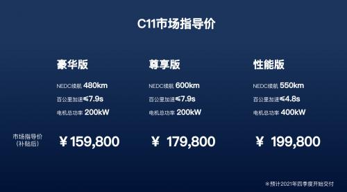 以C11为例,从此前公布的参数来看,这款车电机最大总功率400kW,百公里加速成绩小于4.8秒,同时NEDC续航超过550km――这样的数据,放在任何一款同等级别的车型上基本都是30多万起步,而C11顶配指导价格也不过19.98万元,这还不提最早一批下定用户使用2万抵4万权益后再降2万的实际终端价,可见,性价比毫无意外地会成为这款车的优势,多等几个月就多等几个月吧。