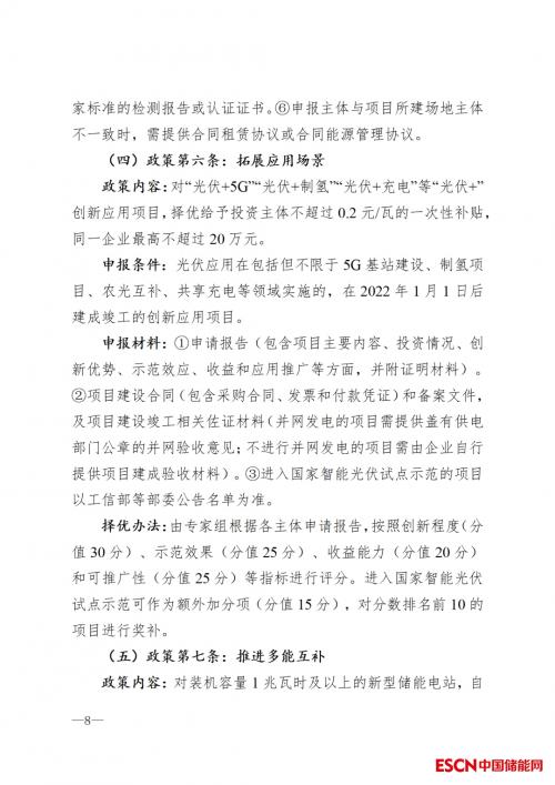 对“光伏+5G”“光伏+制氢”“光伏+充电”等“光伏+”创新应用项目,择优给予投资主体不超过0.2元/瓦的一次性补贴,同一企业最高不超过20万元。
