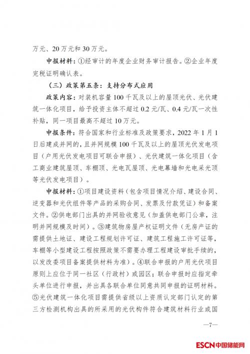 对装机容量100千瓦及以上的屋顶光伏、光伏建筑一体化项目,给予投资主体不超过0.2元/瓦、0.4元/瓦一次性补贴,同一项目最高不超过10万元。