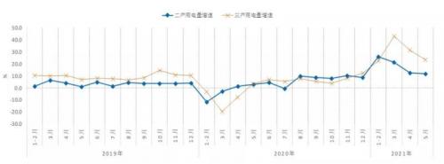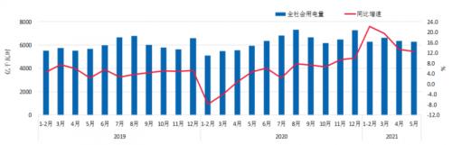 2021年前5个月,第一产业、第二产业、第三产业和城乡居民生活用电量累计增速均实现正增长,分别为21.6%、18.6%、27.8%和4.1%。