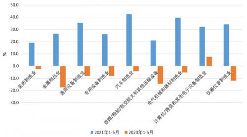 高技术及装备制造业子行业用电量发展势头良好。受新冠肺炎疫情蔓延背景下国外订单回流,我国对主要贸易伙伴出口大幅增长。根据海关总署发布的数据,一季度,我国出口机电产品2.78万亿元,增长43%,占出口总值的60.3%,较去年同期提升1.7个百分点。其中,出口自动数据处理设备及其零部件、手机、汽车分别增长54.5%、38.5%、98.9%。从用电量看,2021年前5个月,高技术及装备制造业用电量同比增长31.0%,其子行业中,电气机械器材制造业、汽车制造业、通用设备制造业及仪器仪表制造业用电量增速超过30%,汽车制造业增速最高为42.3%。1~5月份,高技术及装备制造业用电量两年平均增速10.2%,其中计算机、通信和其他电子设备制造业两年平均增速最高为19.2%,汽车制造业两年平均增速为16.5%。