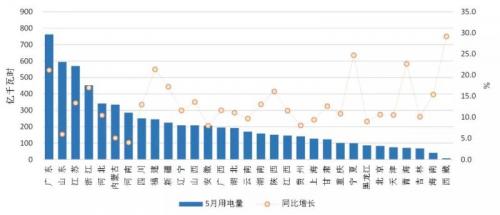 5月当月,广东(762亿千瓦时)、山东(595亿千瓦时)、江苏(570亿千瓦时)、浙江(453亿千瓦时)、河北(342亿千瓦时)用电量排名前五。全国23个省份的用电量增速超过10%。其中,西藏(29.2%)、宁夏(24.7%)、青海(22.7%)、福建(21.4%)、广东(21.2%)等5个省份的用电量增速超过20%。贵州(8.1%)、安徽(8.0%)、山东(6.0%)、内蒙古(5.1%)、河南(4.0%)用电量增速排名后五位。