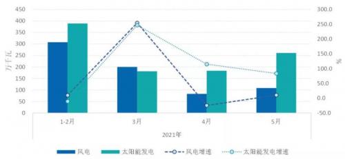 2021年1~5月,全国新增发电装机3734万千瓦,其中,煤电新增704万千瓦,较上年同期减少116万千瓦,并网风电和并网太阳能发电新增装机分别为779万千瓦和991万千瓦,较上年同期分别增加289万千瓦和376万千瓦,合计新增占总新增比重的47.3%,接近一半。风电、太阳能发电月度新增保持较高的增速。