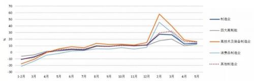 制造业用电量增速快速攀升。2021年1~5月,制造业用电量同比增长20.5%,两年平均增速7.8%,较2019年同期增速同比提高4.4个百分点。5月当月,制造业用电量增速13.7%,同比提高11.2个百分点、环比提高1.0个百分点。2020年以来的月度增速整体走势看,制造业用电量持续稳定增长,从制造业投资看,2021年1~5月份的两年平均增速已经由负转正,后期随着疫苗接种的逐步推开,全球经济总体加快复苏,海外订单向国内转移使得外贸出口表现出强大韧性,将在一段时期内对国内制造业需求保持较高景气。
