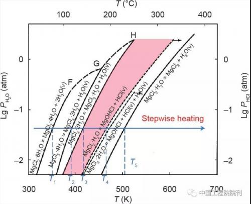 图11基于MgCl2水合物的H2O和HCl的蒸气压图,通过逐步加热对盐进行纯化。1 atm=101 325 Pa。转载自参考文献,已经Elsevier Science Ltd.许可,©2001