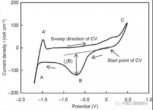 图15含有MgOH+杂质离子的MgCl2/KCl/NaCl熔盐的典型循环伏安图。反应A:Mg2++2e–=Mg(s);反应A′:Mg(s)=Mg2++2e–;反应B:MgOH++e–=MgO(s)+(1/2)H2(g);反应C:Cl–=(1/2)Cl2(g)+e–。T=500℃;工作电极材料:钨;扫描速率:200 mV*s–1。ip(B):反应B的电流密度峰值。转载自参考文献,已经Elsevier Ltd.许可,©2017