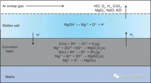 科研人员普遍认为,金属结构材料在高温下与熔融氯盐接触后的腐蚀,是由熔融氯盐中的腐蚀性杂质(如MgOHCl)和气体(如HCl)引起的。
