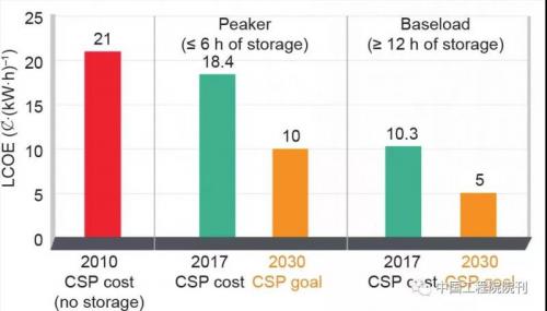 在其后续的“SunShot Initiative 2030”中,基本负荷CSP的LCOE目标是到2030年下降至0.05USD∙kW–1∙h–1。这样低的LCOE将使CSP电站比大多数基于化石燃料的常规电站都更具成本竞争力。