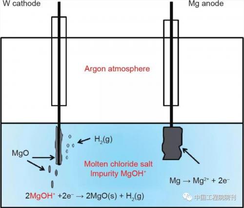 此外,阴极表面会被产生的电绝缘固体MgO钝化。为避免Cl2等有毒气体的产生和电极的钝化,我们课题组在电解中使用了Mg阳极和脉冲电位对MgCl2/KCl/NaCl熔盐进行纯化,从而降低其腐蚀性,具体反应过程如下所示: