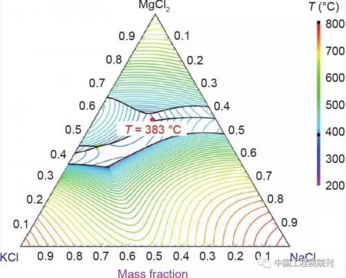 图9利用FactSageTM模拟所得的MgCl2/KCl/NaCl混合盐的相图,其中共晶成分的质量分数为55%/20.5%/24.5%,其经差示扫描量热法(DSC)确认。转载自参考文献,已获Elsevier Ltd.许可,©2018