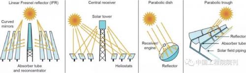 如图1所示,根据不同聚光方式,CSP技术主要分为菲涅尔式、塔式、蝶式和槽式四类。其中,菲涅尔式和槽式CSP属于线性聚焦系统,而塔式和蝶式属于点聚焦系统。