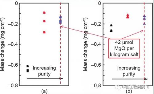 图13在惰性气氛及700℃下,随着KCl-MgCl2盐纯度的提高,浸渍其中的SS 316L(a)和哈氏合金N(Hastelloy N)(b)的质量变化。转载自参考文献,已经Royal Society of Chemistry许可,©2019
