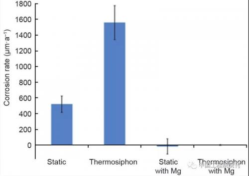 图12在静态和热虹吸的腐蚀测试条件下,Haynes 230合金在有和没有Mg缓蚀剂的850℃MgCl2-KCl熔盐中的腐蚀速率比较