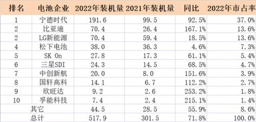 值得一提的是,在特斯拉的订单加持以及自身新能源车型销量火爆的局面下,比亚迪2022年动力电池装机量达到70.4GWh,同比大涨167.1%,与LG新能源并列全球第2位,全球市占率从2021年8.8%上涨到13.6%。