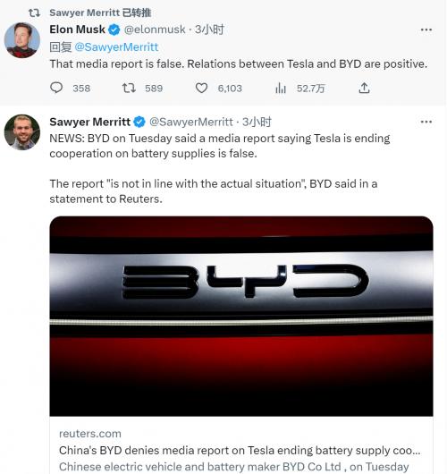 果不其然,3月14日一大早,比亚迪方面就做出回应“不实信息,与实际情况不符。”紧接着,3月14日中午,马斯克本人也在推特上十分明确地回应:“有关‘特斯拉将停止与比亚迪合作’的报道是假的,特斯拉和比亚迪的关系是积极的。”