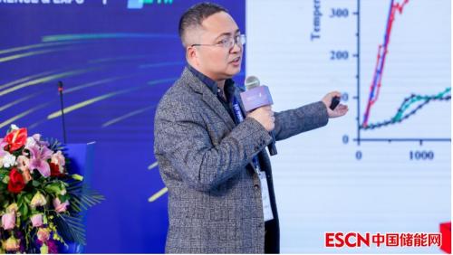 千页科技解决方案部总监邱仲良围绕户外工商储能柜的灭火特点,阐述了具有千页特色的消防解决方案,即通过复合火灾探测器及早发现电池热失控,主动/被动预警,非储压全氟己酮灭火装置多次点喷,实现PACK级防护。