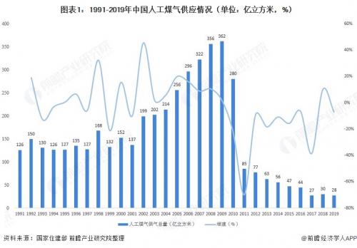 国家住建部数据显示,1991-2009年,我国人工煤气供应量不断增加,2009年达到顶峰,人工煤气供应达到362亿立方米,2009-2019年我国人工煤气供应量不断减少,2019年我国人工煤气供应量仅为28亿立方米,可以预见未来我国人工煤气供应将进一步减少。