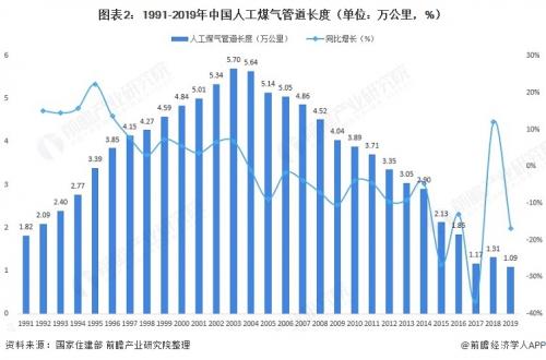 人工煤气管道长度同样经过上世纪90年代的大幅增长后,由于进入21世纪后使用人数逐年减少,煤气管道长度也随之减少。根据住建部数据显示,1991-2003年,我国人工煤气管道长度不断增加,2003年人工煤气管道长度达到巅峰为5.7万公里,随后开始逐步下降,2019年我国人工煤气管道长度为1.09万公里。