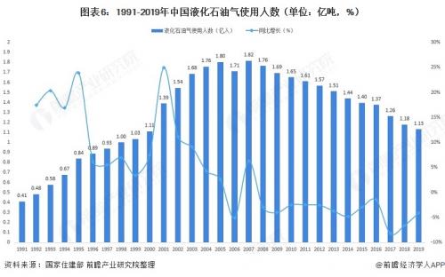 上世纪90年代以来,我国液化石油气使用人数不断增加,1991年使用液化石油气人数仅为0.41亿人,2007年见顶达到1.82亿人,之后则不断下降,2019年使用液化石油气人数为1.13亿人。