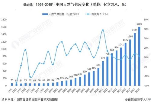 由于天然气的以上特点,住建部数据显示,1991-2019年我国天然气供应量不断增加,由最初1991年供应量仅为75亿立方米快速上涨至2019年的1609亿立方米,2019年天然气供应是1991年的21倍多。