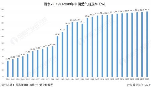 城市燃气普及率=城市建成区使用燃气人数/城市建成区人口×100%,城镇燃气作为城镇基础设施建设的重要组成部分,在提升市民的生活质量、改善自然环境和社会环境、推动经济和社会的可持续发展等方面发挥着越来越重要的作用。自1991年以来我国城市燃气普及率稳步上升,2019年已经达到97.29%。