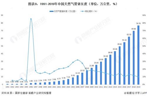 天然气是优质高效、绿色清洁的低碳能源。加快天然气开发利用,促进协调稳定发展,是我国推进能源生产和消费革命,构建清洁低碳、安全高效的现代能源体系的重要路径。1991-2019年我国天然气管道长度逐年上升,1991年我国天然气管道长度仅为0.81万公里,而2019年则达到76.79万公里。经过前期快速发展,后期增速逐步放缓,2019年增速为10%。