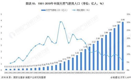 由于天然气相对安全性,价格相对具有明显的经济性,但前期由于开采有限,1991-2001年我国使用天然气人数保持缓慢增长,1991年使用天然人数仅为0.11亿人,2001年增加至0.31亿人,进入21世纪我国使用天然气人数直线上升,到2019年则达到3.90亿人。