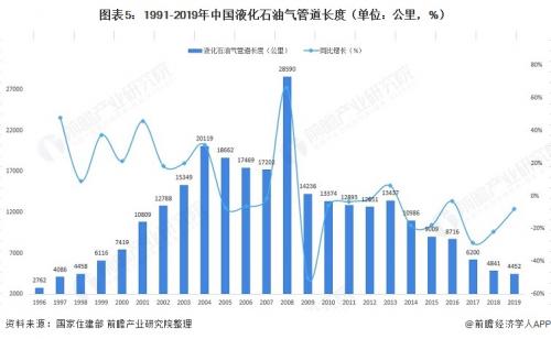 1991-2004年我国液化石油气管道长度经历了稳定增长,由1991年2762公里增加至2004年的20119公里,最后有所下降,2008年经过飞速增长后达到28590公里以后,我国液化石油气管道长度开始下降,2019年中国液化石油气管道长度4452公里。