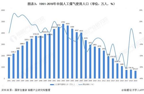 人工煤气供应量经过上世纪90年代的大幅增长后,由于其污染较大、毒性较强等缺点,进入21世纪后使用量逐年减少。根据住建部数据显示,1991-2003年,我国使用人工煤气人数不断增加,2003年使用人数达到巅峰为4792万人,随后开始逐步下降,2019年我国使用人工煤气人数为675.37万人。