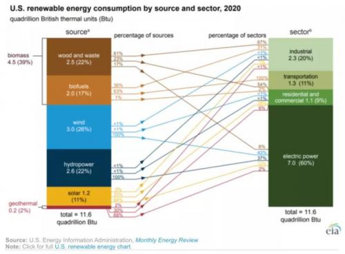 据美国能源信息署的数据,2020年美国可再生能源消费量连续第五年增长,达到创纪录的1160亿英热单位(Btu)是2019年到2020年之间唯一增长的能源;而化石燃料和核能消耗量下降。
