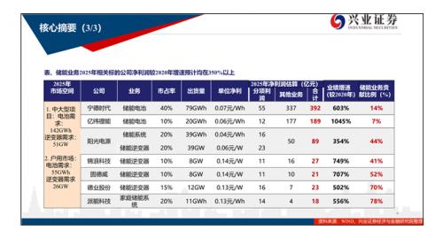 据兴业证券预计,截至2021年底,化学储能领域的电池PACK市场规模将达204亿元,而到2030年,电池PACK的市场规模将超4000亿元.而据兴业证券测算,截至2025年宁德时代的储能业务国内市占率将达40%,并提供约55亿元的利润.按60倍市盈率的估值测算,届时宁德时代的储能业务将为其带来超过3000亿元的市值.