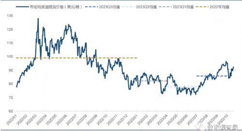 2023年前三季度,国际油价先下跌后反弹,但距2022年的价格仍有差距,布伦特原油均价为81.96美元/桶,同比下降20%。中国海油受国际油价影响较大。