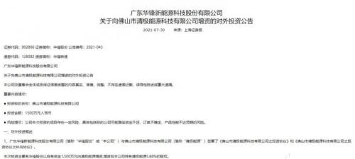 7月29日,华锋股份发布《关于向佛山市清极能源科技有限公司增资的对外投资公告》,将向清极能源增资1500万元人民币。