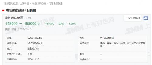 据上海有色网,截至11月10日,电池级碳酸锂均价为15.3万元/吨,相比2022年11月近60万元/吨的高点,同比下滑超过70%,创下两年内的新低。