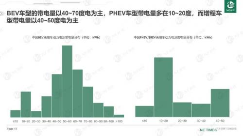 电量分布上,EV车型带电量以40-70kWh为主,50-60kWh应用最普遍,PHEV中10-20kWh搭载量最多,增程则是在40-50kWh左右。