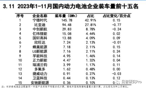 比亚迪的前11个月的累计动力电池装机量高达94.48GWh,市场份额增加了4.7个百分点到27.81%,在单独的磷酸铁锂电池领域则已经完成了对宁德时代的反超。