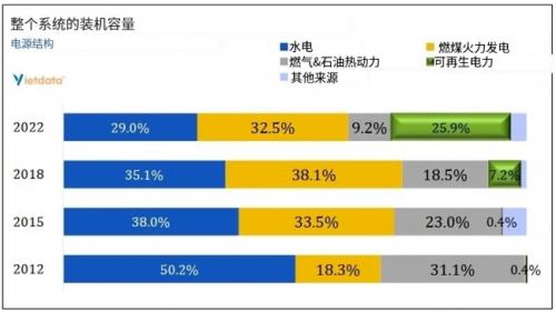 如果把水电看作可再生资源,越南的可再生资源装机占比已经高达55%(见下图)。即使不算水电,风电光伏的增速也非常罕见,在最近七八年从无到有,现在的占比已经超过四分之一。