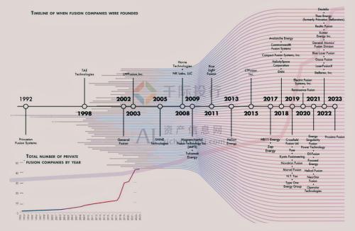 在过去的几年中,可控核聚变行业目睹了其公司数量的显著增长,从2022年的33家增长至2023年接近50家,尽管一年内有3家退出市场,但新增了13家公司。这一增长趋势不仅体现了行业内技术路径的多元化,也反映了越来越多团队对于聚变技术潜力的认可和投入。