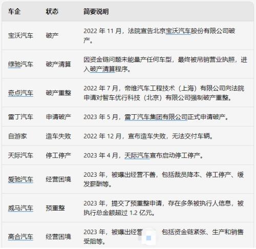 自2022年以来,已有超7个生存不佳的新能源车企陷入困境,包括但不限于:宝沃汽车、绿驰汽车、奇点汽车、雷丁汽车、自游家、天际汽车、爱驰汽车、威马汽车、高合汽车等。