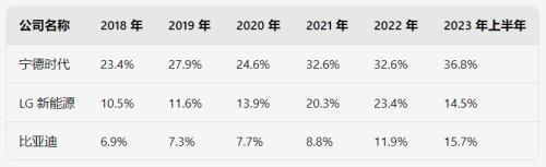 从过去5年看,3家公司的市场排名变化不大。宁德时代长期第一,LG新能源长期第二,比亚迪长期第三。但在2023年上半年,比亚迪实现反超,成为全球第二。