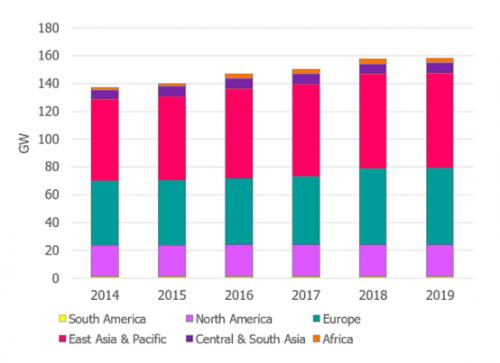国际水电协会(IHA)数据显示,截至2019年底,全球抽水蓄能总装机容量接近160吉瓦,占全球储能装机容量的94%以上,占电网级储能的96%以上。大部分抽水蓄能设施在欧洲和亚洲运营。其中,中国抽水蓄能装机规模占世界总量的19%,居世界第一,其次是日本和美国(见图2)。