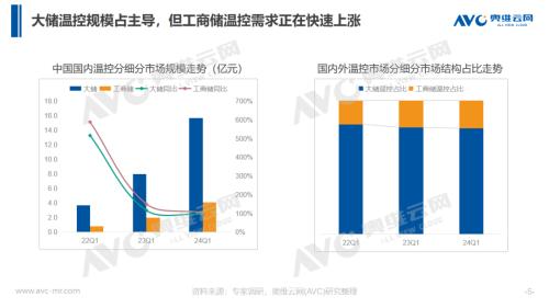 从温控产品应用场景来看,在我国配储政策下源网侧大储温控产品的市场规模一直占据主导地位,但由于近些年来工商储因其投资规模小、回报周期短、商业模式丰富而经济性凸显,工商储温控需求也正在快速上涨,尤其2023年更是被业内认为“工商储元年”。根据奥维云网(AVC)调研数据,2024年Q1我国工商储温控产品销售规模同比增长105%,结构占比突破20%。