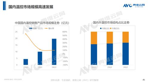 在我国新型储能市场的高速发展下,储能温控市场规模也随之水涨船高,步入高速发展快车道。根据奥维云网(AVC)调研统计,2024年Q1中国储能温控市场总销售额约为19.8亿元,同比增长98%。从内外销来看,受北美光伏市场挤压、欧洲户储库存高企影响,海外储能市场增速也有所放缓,此消彼长下内销占比逐渐走高,2023年Q1占比已超65%。