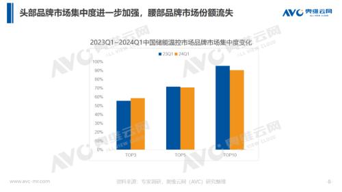 虽然我国的储能温控市场目前只有几十亿的体量规模,但在储能大市场如火如荼地发展加持下,热管理温控小市场也被诸多业内人士所看好。因为产品技术原理的相近性,当前储能温控市场的主流玩家都是从工商业温控设备赛道所切入进来,分别是以英维克为代表的数据中心温控厂商,以同飞股份为代表的工业设备温控厂商,以及以松芝股份为代表的车用电池温控厂商。三类厂商各有优势,但同时也注意到厂商背景的不同也导致产品功能配置及市场策略的差异性。除此之外,以海信为代表的传统家用空调厂商也在跃跃欲试。从品牌市场集中度来看,在占据市场规模一半以上的前提下,TOP3品牌的市场集中度进一步加强,2024年Q1 TOP3品牌市场份额占比接近60%,而TOP5及TOP10品牌的市场集中度却在下滑,由此我们认为储能温控市场已形成寡头市场。在此背景下,基于头部玩家规模优势下的成本控制,以及后进入玩家的市场低价策略,共同推动了储能温控产品的市场均价下行趋势。